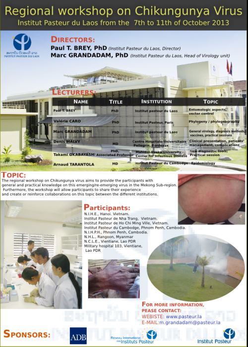 The regional workshop on Chikungunya virus aims to provide the participants with general and practical knowledge on this emerging/re-emerging virus in the Mekong Sub-region. Furthermore, the workshop will allow participants to share their experience and create or reinforce collaborations on this topic between the different institutions.